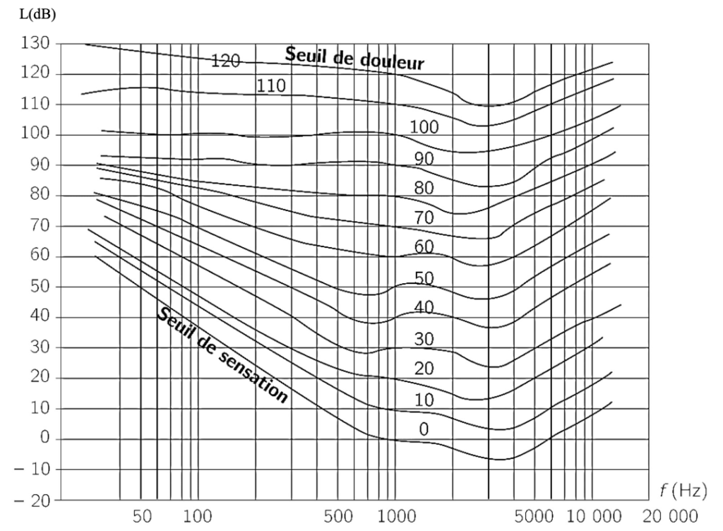 Ce diagramme représente des courbes de même perception des sons par une oreille humaine normale (courbes isosoniques).