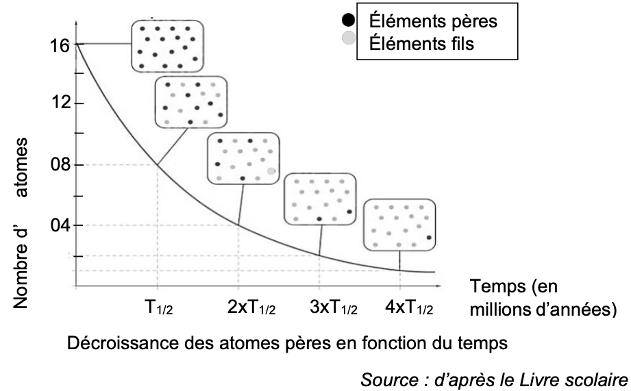 1 – Le temps de demi-vie (ou période radioactive T1/2) correspond à la durée écoulée lorsqu’une certaine quantité d’éléments pères est désintégrée. À partir du graphique du document 1, dire quelle est la proportion d’éléments pères désintégrée à T1/2.