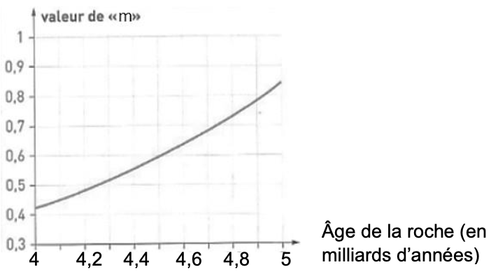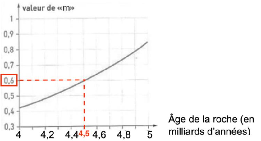 Graphiquement pour m=0,6, l’âge de la roche est de 4,5 milliards d’années.