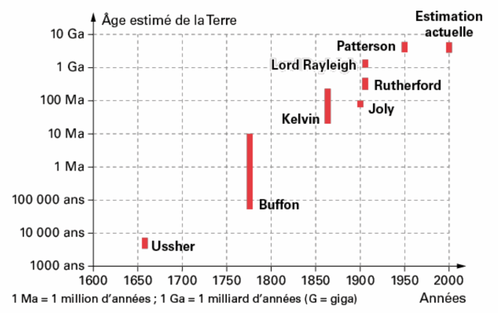Le graphique ci-dessous représente les âges donnés à la Terre par quelques auteurs au cours de notre Histoire.