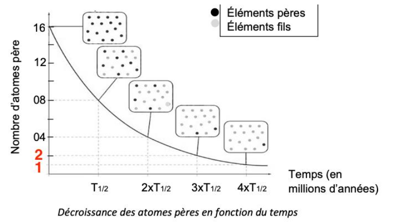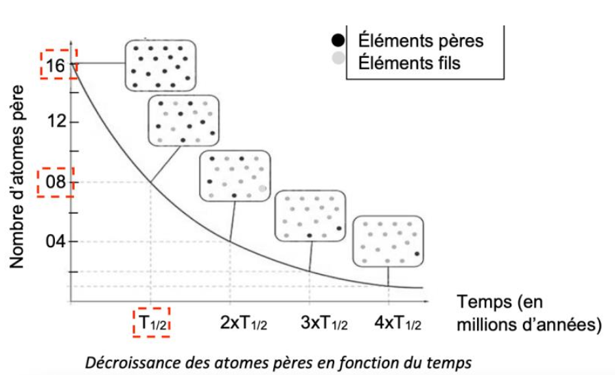 Pour dater de manière absolue les roches, on utilise le principe de décroissance radioactive : au cours du temps, des éléments pères radioactifs se désintègrent en éléments fils, comme représenté ci-dessous