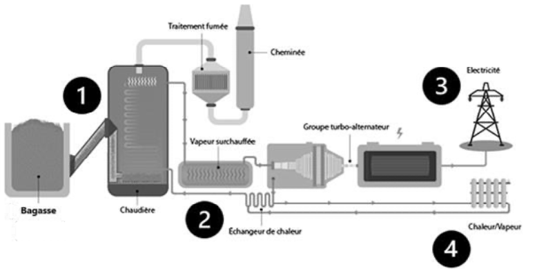 On appelle bagasse, le résidu fibreux restant après broyage et extraction du jus de la tige de la canne à sucre. La bagasse est essentiellement constituée de cellulose. Elle est disponible en grande quantité sur l’île de la Réunion. Ce résidu peut donc être utilisé comme combustible dans une centrale thermique que l’on nomme aussi centrale à bagasse pour produire de l’électricité. Sa combustion à plus de 500°C, émet de la vapeur, qui fait tourner des turbines, et produit de l’électricité.