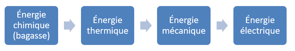 7- Schématiser la chaine de transformation énergétique permettant d’obtenir de l’énergie électrique à partir de la bagasse.
