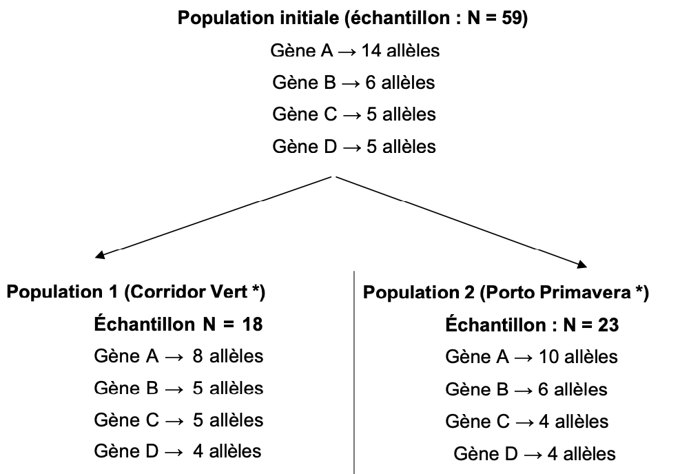 Le document montre une réduction du nombre d’allèles pour plusieurs gènes (A, B, C, D) entre la population initiale (N = 59) et les populations fragmentées (Corridor Vert, N = 18 et Porto Primavera, N = 23). Par exemple, pour le gène A, on passe de 14 allèles à seulement 8 ou 10.