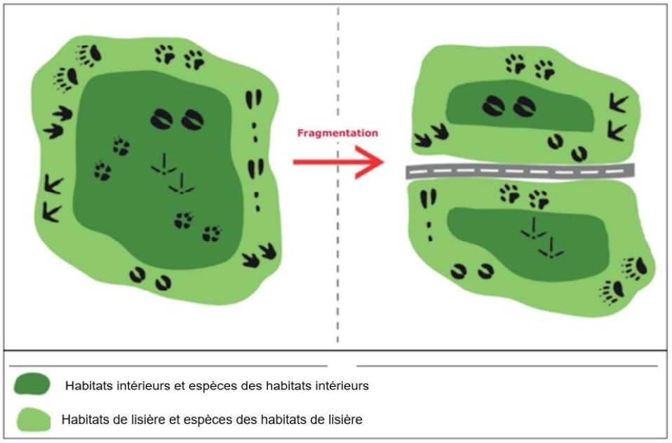 Les infrastructures humaines (routes, grillages, espaces bâtis, etc.) séparent un écosystème en plusieurs petits habitats. Les espèces vivant dans l’écosystème sont alors scindées en plusieurs petites populations, souvent isolées. Les espèces dites spécialistes occupent les habitats intérieurs et les espèces généralistes occupent plutôt les habitats de lisière.
