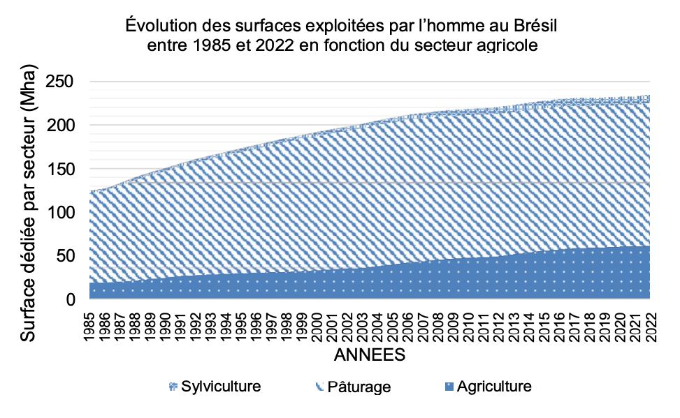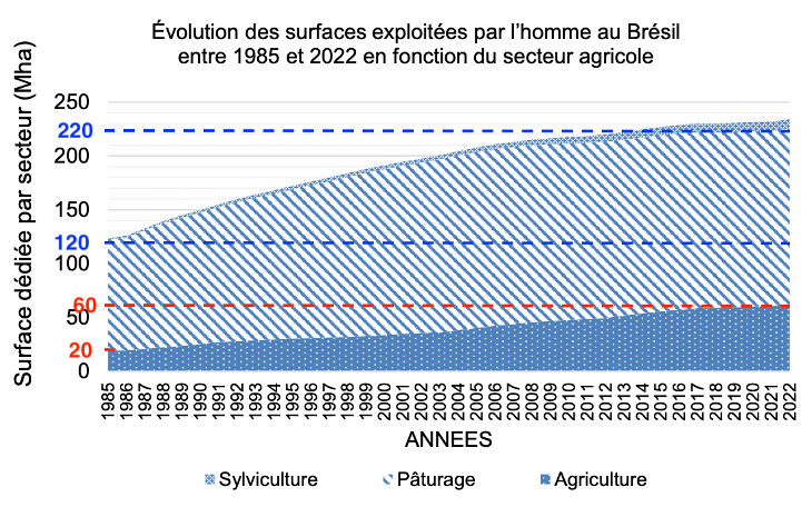 Entre 1985 et 2022, les surfaces agricoles au Brésil ont fortement augmenté, notamment pour le pâturage (qui est passée de 20 à 60 Mha) et l’agriculture (qui est passée de 120 à 220 Mha), ce qui a entraîné une forte fragmentation des habitats naturels.