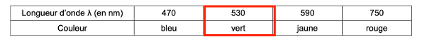 | Longueur d’onde λ (en nm) | 470 | 530 | 590 | 750 |