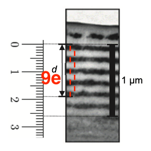 L’échelle de la photographie est indiquée grâce à la barre verticale noire située à droite : cette barre indique une longueur de 1 µm.
