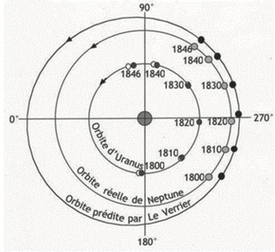 Suite à la découverte de la planète Uranus en 1781 et à l’étude de sa trajectoire, certains astronomes supposèrent l’existence d’une autre planète qui influencerait son mouvement. En 1846, le français Urbain Le Verrier parvint à proposer, par le calcul, des caractéristiques de cette nouvelle planète. Grâce aux indications de Le Verrier et à l’aide de la lunette astronomique de l’observatoire de Berlin, l’astronome Johann Galle repéra dès ses premières nuits d’observation le nouvel astre qui porte depuis le nom de Neptune.