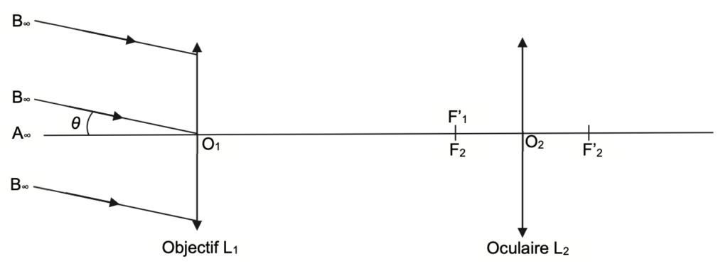 Position de B1 image intermédiaire de B : Comme l’objet A∞B∞ est à l’infini, son image A1B1 est dans le plan focal image de l’objectif L1.