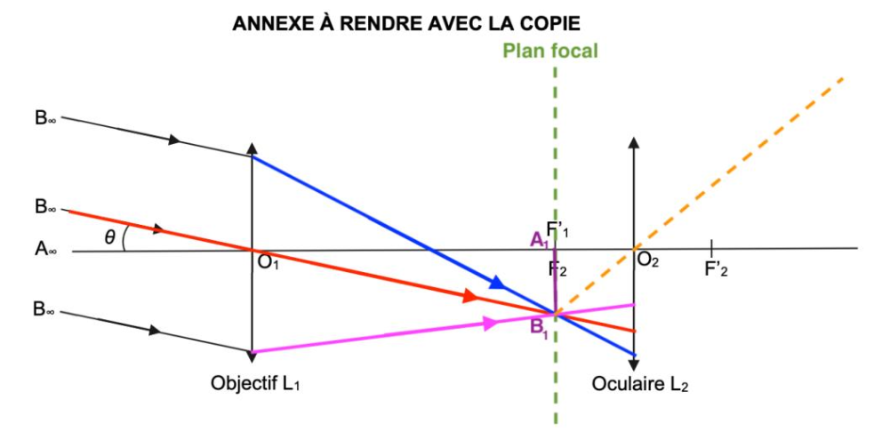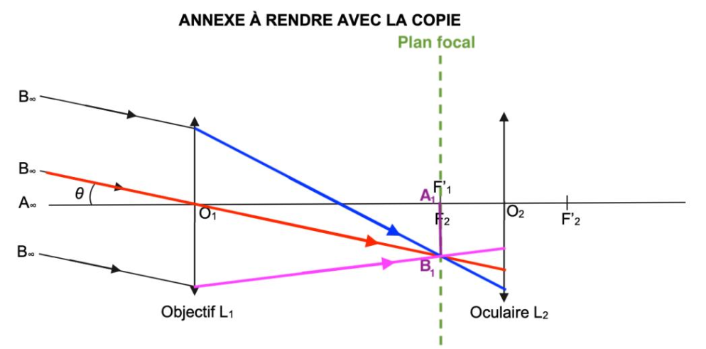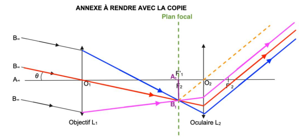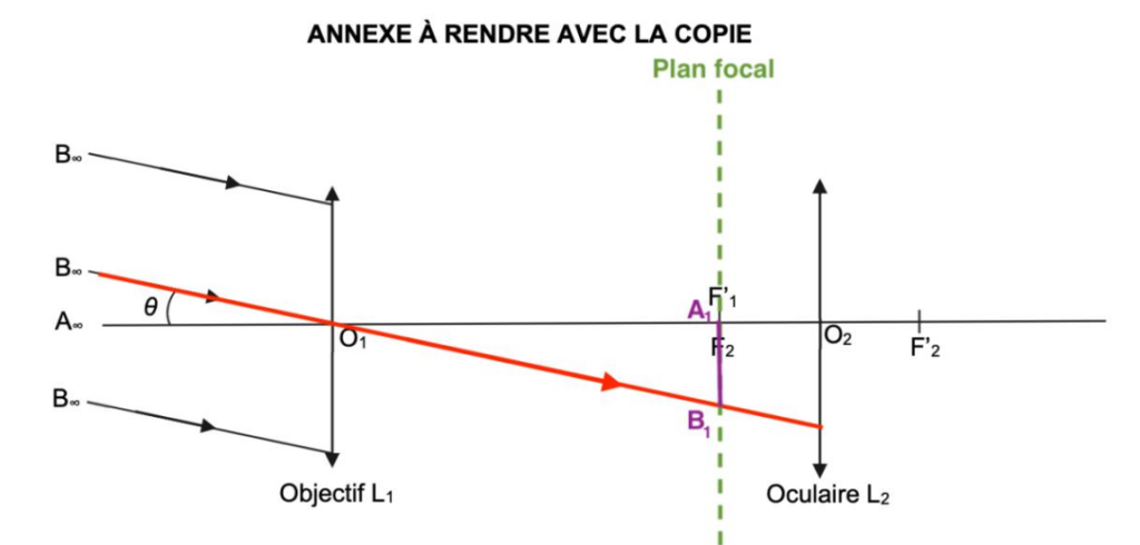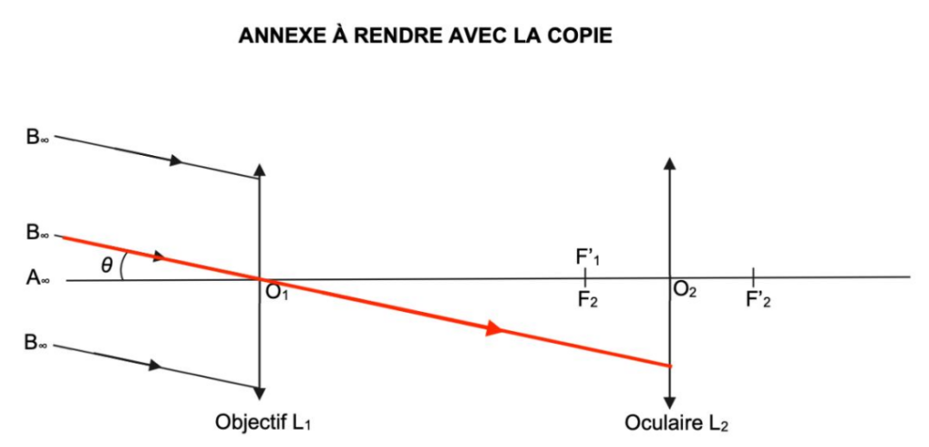 Sur la figure 3 de l’ANNEXE À RENDRE AVEC LA COPIE, la planète Neptune est modélisée par un objet AB situé à l’infini. Le point A est situé sur l’axe optique. Les rayons qui arrivent de A sont parallèles à l’axe optique. Le point B est situé en dehors de l’axe optique. Les rayons issus de B sont parallèles entre eux et atteignent la lentille L1 avec une inclinaison θ par rapport à l’axe optique.