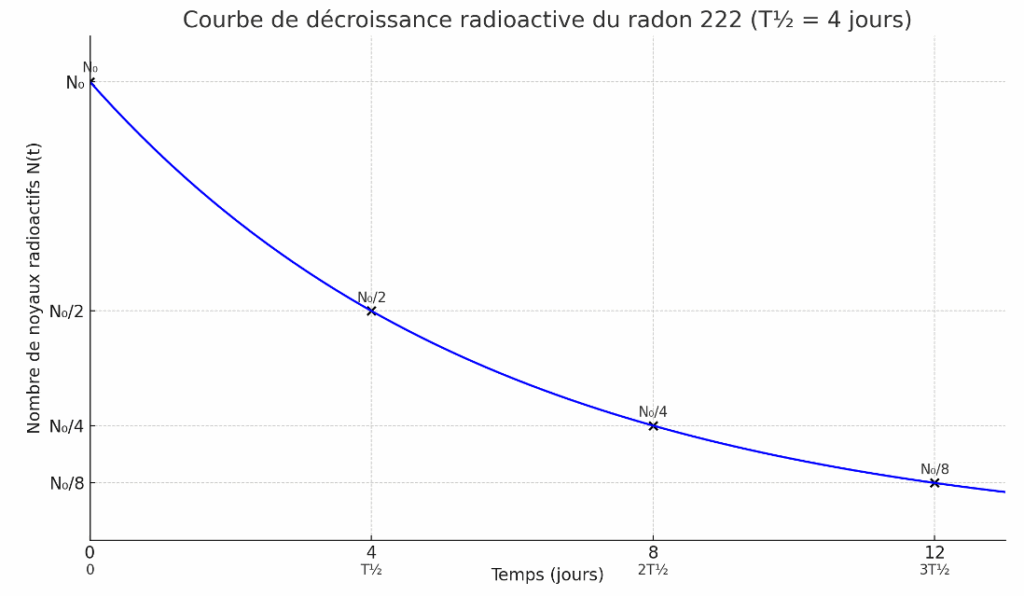 Q.9. Tracer l’allure de la courbe d’évolution de décroissance radioactive du radon 222, $N = f(t)$, d’un échantillon ayant une population initiale $N_0$ de noyaux radioactifs. Représenter la demi-vie du radon 222 sur cette courbe.