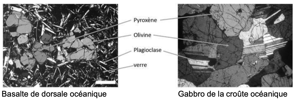 Les basaltes et les gabbros sont des roches magmatiques qui se forment dans plusieurs contextes géologiques, notamment au niveau des dorsales océaniques.