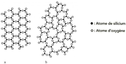 1. La figure du document 1 montre deux structures possibles de la silice. L’une est dite cristalline, l’autre amorphe (verre). Parmi les représentations a et b, préciser laquelle correspond à une structure cristalline. Justifier votre choix.