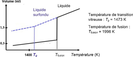 D’après le texte du document 2, La courbe relative au cristal est en trait continu ; elle correspond à la vitesse de refroidissement la plus faible. La courbe relative au verre est un trait discontinu ; elle correspond à la vitesse de refroidissement la plus forte.