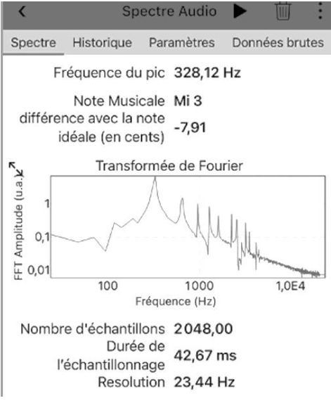 À l’aide de son smartphone et d’une application dédiée, il enregistre le son joué et en obtient le spectre (figure ci-dessous).