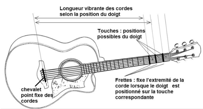 Le guitariste reprend cette expérience en déplaçant son doigt sur différentes touches (voir figure ci-dessous) sur la même corde, la plus fine.