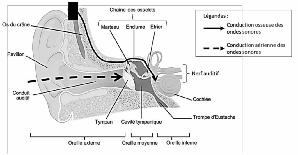 • La conduction par voie osseuse : le praticien teste la conduction du son à travers les os du crâne grâce à un vibrateur placé à l’arrière de l’oreille.