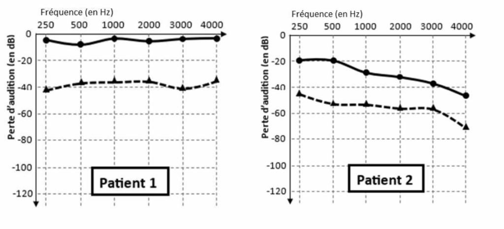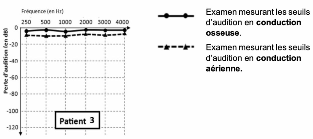 Seuls les résultats de l’oreille droite sont présentés ci-dessous. Le guitariste et les deux autres patients sont tous âgés d’une vingtaine d’années.