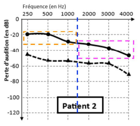 Diagnostic 2 :    Le tympan et les osselets sont probablement lésés mais ; la cochlée n’est pas atteinte. Il s’agit d’une surdité de transmission qui affecte l’oreille externe et/ou moyenne.