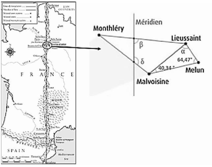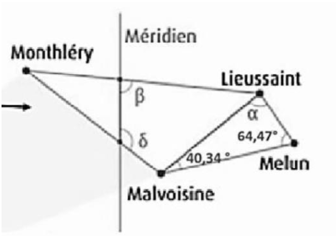 On peut effectuer une triangulation à partir de la connaissance de la longueur d’une première base de 6075,90 toises1 entre Melun et Lieussaint, deux villes situées en Seine-et-Marne (77). Ainsi, à partir des extrémités de cette base, Jean- Baptiste Delambre vise Malvoisine. De la mesure des angles, il déduit la distance Lieussaint-Malvoisine et celle-ci constitue la base d’un nouveau triangle dont le sommet sera Montlhéry. Une chaîne de triangles successifs juxtaposés est ainsi formée le long de la méridienne. L’arc de méridien Dunkerque-Barcelone a pour longueur un quarantième de méridien terrestre.