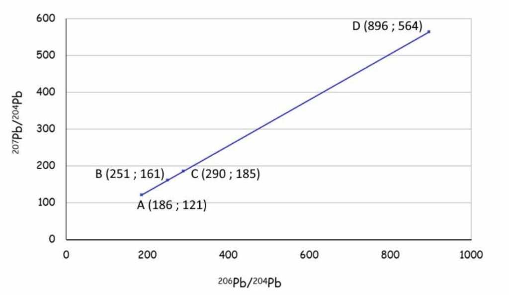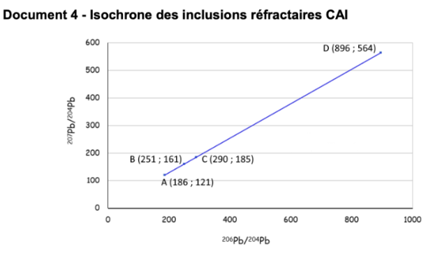 On mesure alors les rapports du nombre d’atomes entre ces isotopes et l’isotope 204Pb, autre isotope stable du Plomb, dans différentes inclusions réfractaires CAI prélevées dans la météorite. Ces rapports sont appelés rapports isotopiques et sont notés (206Pb/204Pb) et (207Pb/204Pb). Lorsque ces échantillons se sont bien formés à la même époque, à partir d’un même matériau source, la représentation graphique de (207Pb/204Pb) en fonction de (206Pb/204Pb) est une droite appelée droite isochrone.