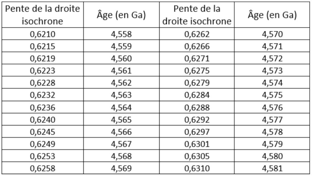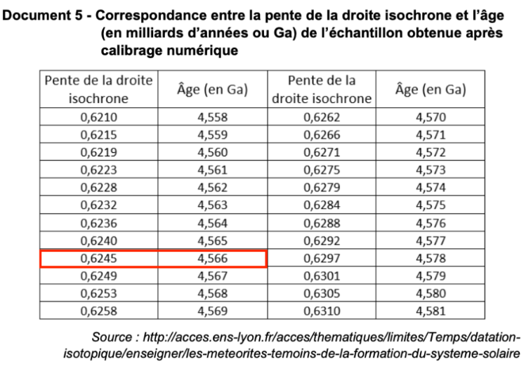 En utilisant le tableau du document 5 l’âge correspondant à la pente 0,6245 est 4,566 Ga.