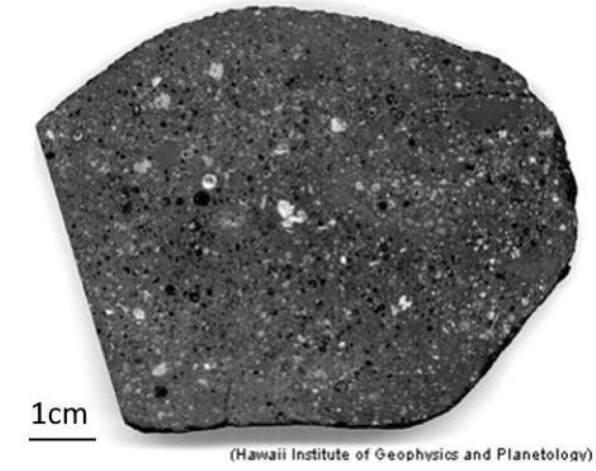 La météorite Allende est une météorite non différenciée de type chondrite. Les chondrites sont constituées de chondres, un mélange de silicates et de métal, et des inclusions CAI (Calcium Aluminium Inclusions), le tout englobé dans une matrice qui « cimente » l’ensemble. Les inclusions réfractaires CAI sont riches en uranium. Formées à très hautes températures, elles sont considérées comme les plus vieux objets du système solaire.