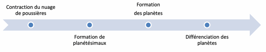 En nous basant sur le document 1, nous élaborons la frise chronologique simplifiée avec les principales étapes de la formation du système solaire :
