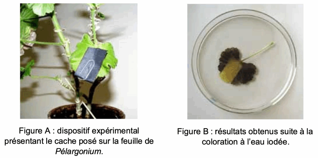 Une expérience est réalisée en laboratoire avec une feuille de Pelargonium, recouverte partiellement d’un cache, éclairée pendant 12 heures. Le dispositif expérimental est présenté dans la figure A ci-dessous. Le cache est ensuite enlevé et la feuille est décolorée dans de l’éthanol bouillant sous hotte en présence d’un dispositif réfrigérant. La feuille est ensuite colorée à l’aide de l’eau iodée. L’eau iodée adopte une coloration noir-violet en présence d’amidon (glucide). Elle reste jaune en l’absence d’amidon. Les résultats obtenus sur la feuille sont présentés sur la photographie de la figure B.
