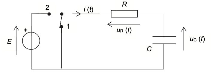 L’interrupteur est préalablement placé en position 1 afin de décharger le condensateur. À l’instant t = 0, le condensateur est déchargé et l’interrupteur est basculé en position 2.