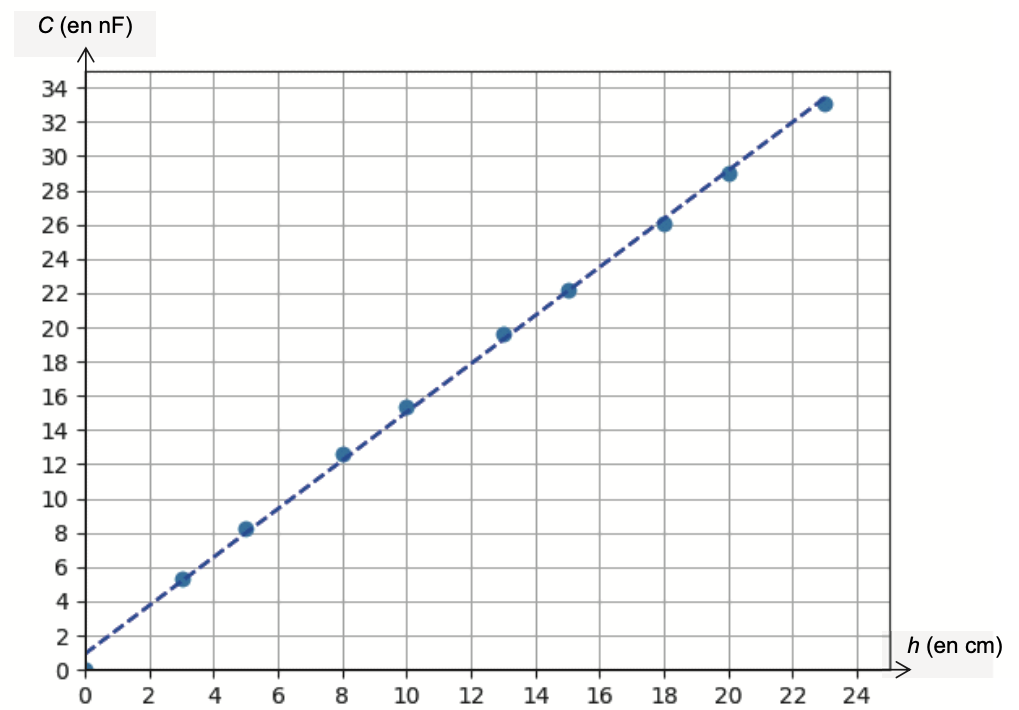 L’expérience est reproduite pour différentes hauteurs h de liquide. La représentation graphique de la variation de la capacité du condensateur en fonction de la hauteur de liquide est donnée en figure 6. Une droite de modélisation y a été tracée.