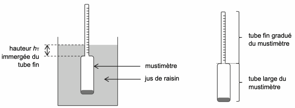 Pour cela, le vigneron utilise un mustimètre, appareil qui mesure la masse volumique ρjus du jus. Cette mesure permet ensuite de connaître la concentration en masse de sucre. On étudie dans cette partie le principe de fonctionnement d’un mustimètre.