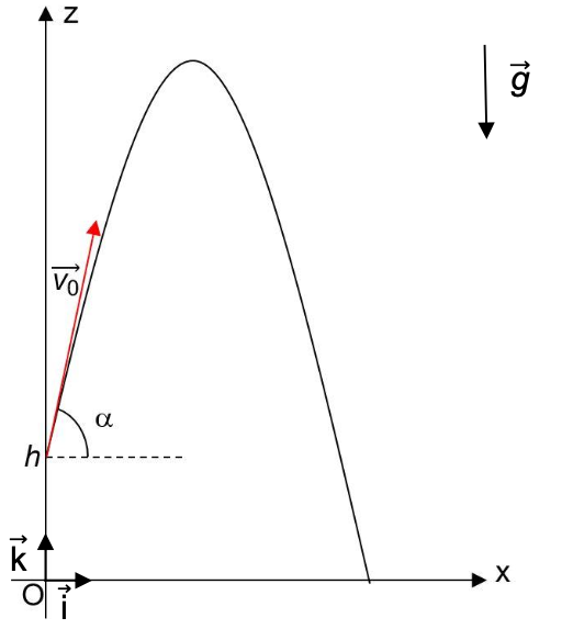 $$\overrightarrow{v}_0\begin{pmatrix}v{0x}=v_0\cos\alpha\\v{0z}=v_0\sin\alpha\end{pmatrix}$$