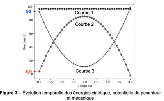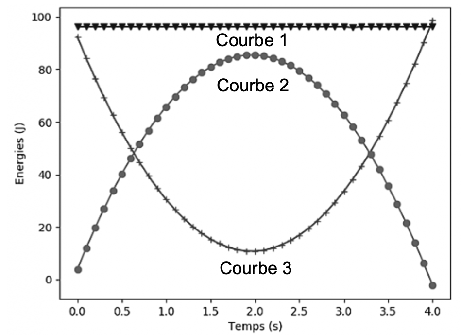 La courbe de l’énergie mécanique est donc au-dessus des courbes de l’énergie cinétique et l’énergie potentielle de pesanteur : courbe 1.