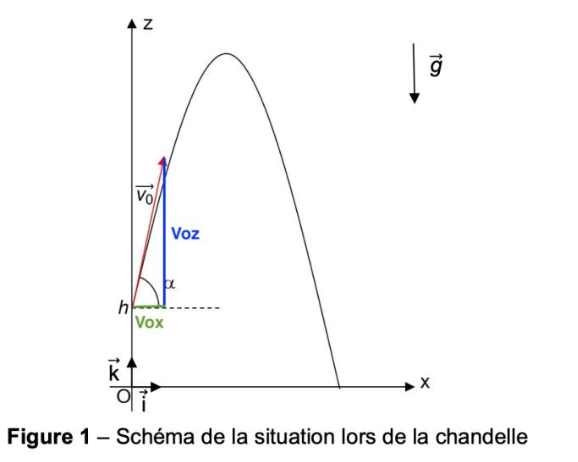 À t = 0 s, le joueur communique au ballon, de masse m, une vitesse $\overrightarrow{v_0}$ qui forme un angle α avec l’horizontale. Le ballon se trouve alors à une hauteur h au-dessus du sol comme indiqué sur la figure 1.