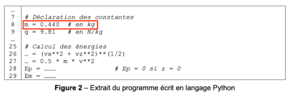 Dans l’extrait du code Python (figure 2, ligne 8), la masse du ballon est donnée : $m=0.440\ kg$