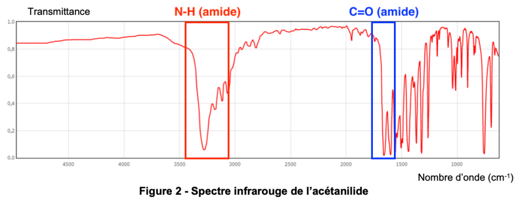 2. Montrer que le spectre infrarouge de l’acétanilide (figure 2 ci-dessous) permet de confirmer que l’acétanilide appartient bien à cette famille fonctionnelle.
