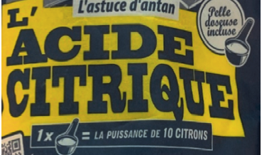 « 1 pelle doseuse = la puissance de 10 citrons » notée sur l’emballage d’un produit ménager (voir photo ci-contre).