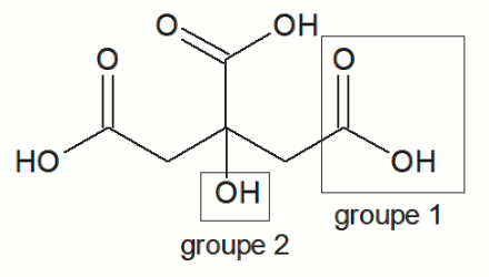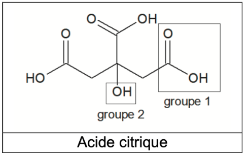 Q1. Nommer les groupes caractéristiques 1 et 2 encadrés sur la formule topologique de l’acide citrique. Préciser celui qui est responsable des propriétés acides de la molécule dans l’eau.