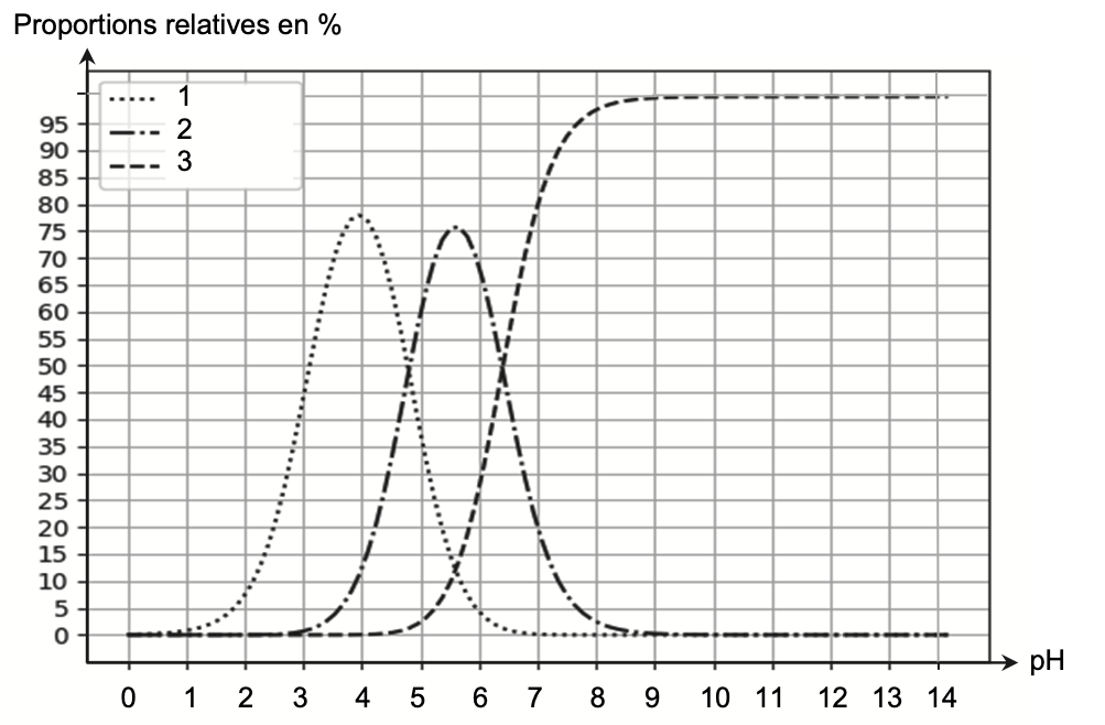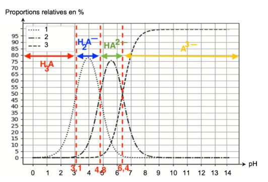 Q4. Attribuer à chaque courbe numérotée du diagramme de distribution de l’acide citrique l’espèce chimique correspondante. Justifier ces attributions.