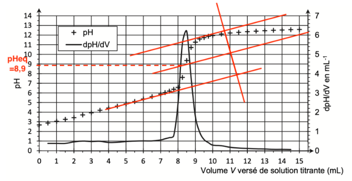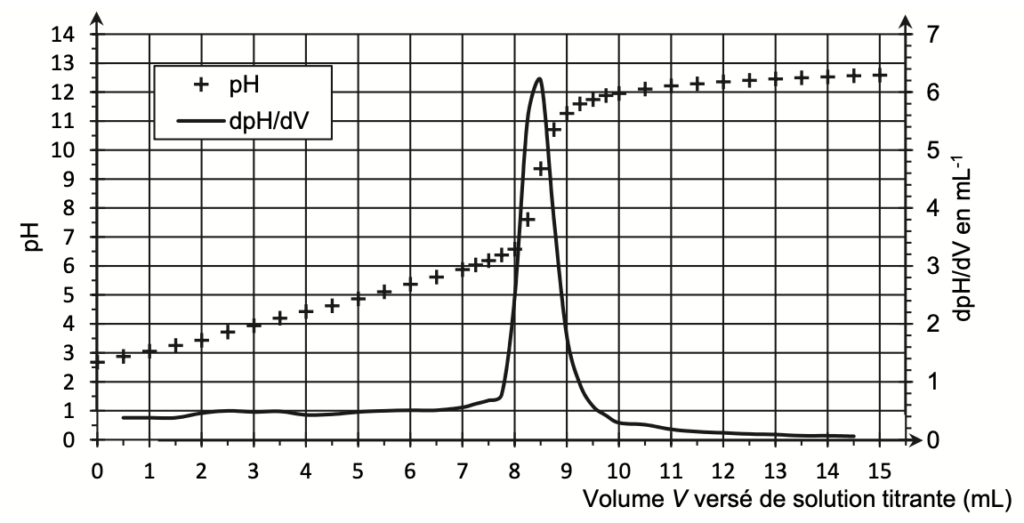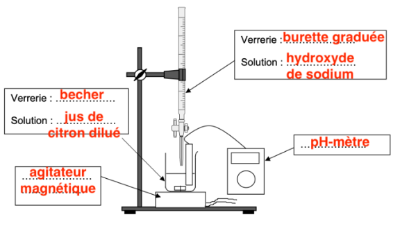 • prélever un volume Vdilué = 25,0 mL de jus de citron dilué et réaliser le titrage par une solution aqueuse d’hydroxyde de sodium de concentration cB = 2,5×10–1 mol·L–1, à l’aide d’un suivi pH-métrique.