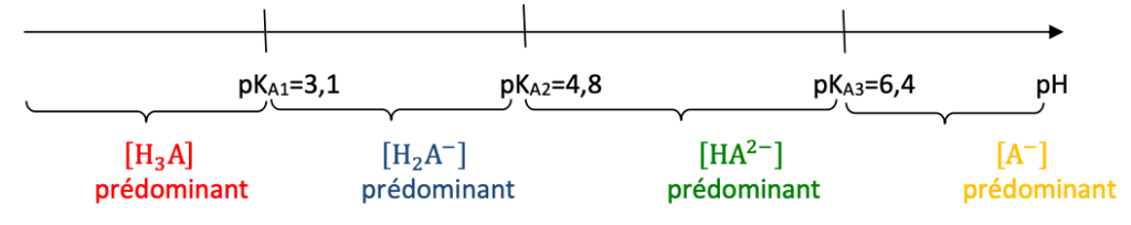 • les autres espèces acide-base associées à l’acide citrique sont notées H2A, HA2– et A3– ;