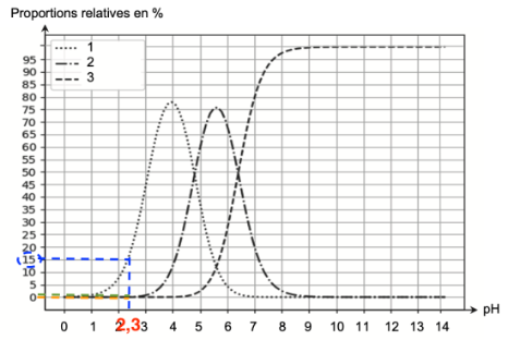 Q8. Déterminer si les proportions du diagramme de distribution à pH = 2 ,3 sont cohérentes avec la valeur du quotient $\frac{[H_2A^-]{\text{eq}}}{[H_3A]{\text{eq}}}$ calculée à l’aide de la relation démontrée la question Q7.