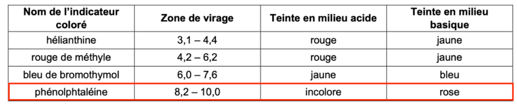 Q12. Choisir dans le tableau ci-dessous, en justifiant, un indicateur coloré adapté à ce titrage. Préciser, en justifiant, le changement de couleur de l’indicateur coloré à l’équivalence.