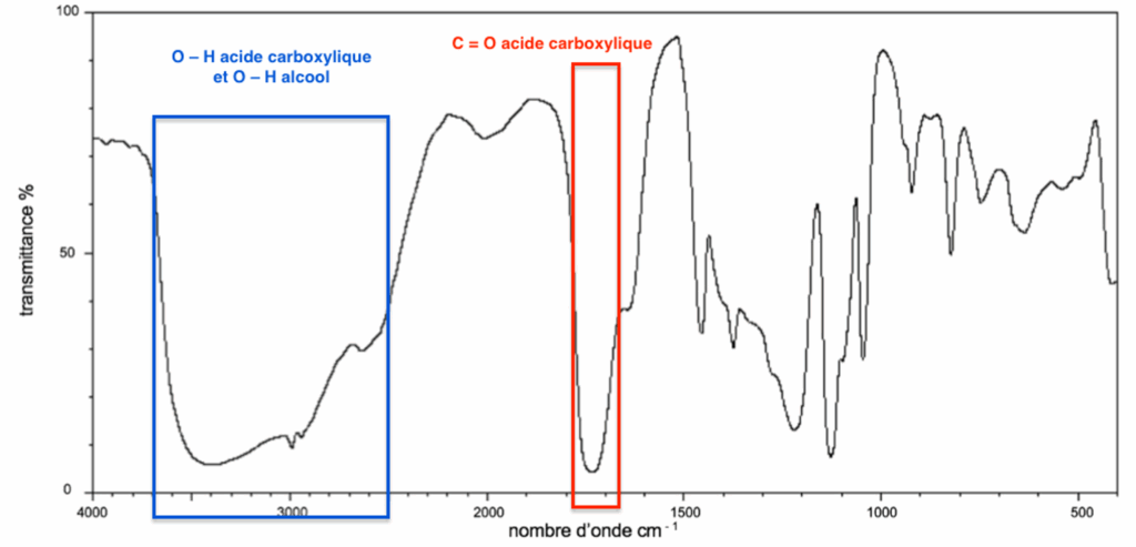 A.10. Utiliser le spectre de la figure 2 et la table spectroscopique infrarouge simplifiée afin de justifier la présence de deux liaisons caractéristiques de la molécule d’acide lactique.