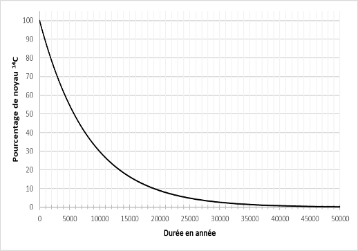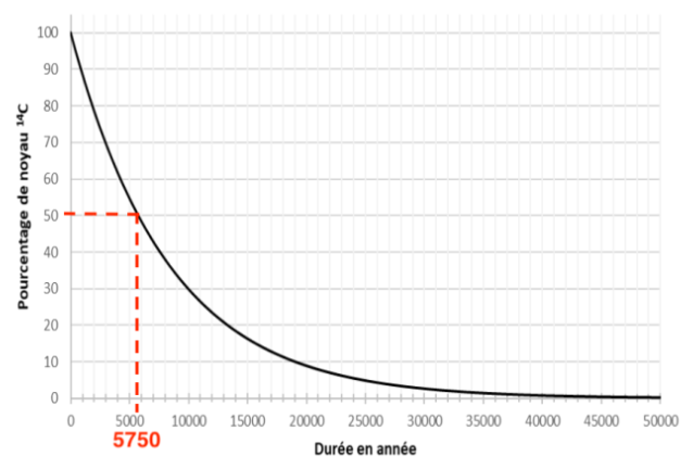 5 – Sur la figure du document A en annexe à rendre avec la copie, vérifier que valeur de la demi-vie du carbone 14 est de 5 750 ans. Faire apparaître la construction graphique utilisée et l’expliciter.