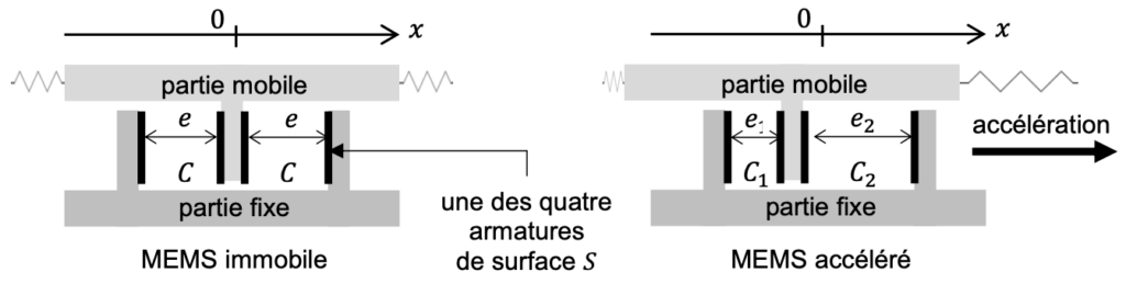 2. L’accéléromètre MEMS est constitué d’une partie mobile qui, soumise à une accélération, entraîne le déplacement de l’armature commune aux deux condensateurs. En l’absence d’accélération, chaque condensateur a une capacité 𝐶. On considère un déplacement de l’accéléromètre MEMS suivant Ox, lorsqu‘il est soumis à une accélération, leurs capacités prennent respectivement les valeurs 𝐶1 et 𝐶2 comme l’illustrent les schémas de la figure 3.
