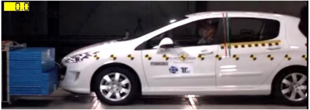 1. Lors du crash-test, la voiture arrive à vitesse donnée sur l’obstacle.
