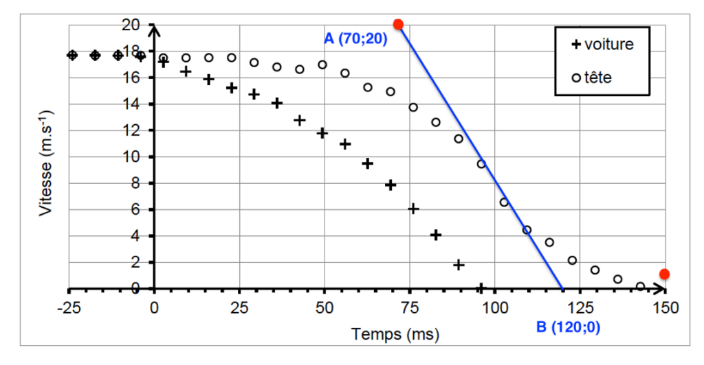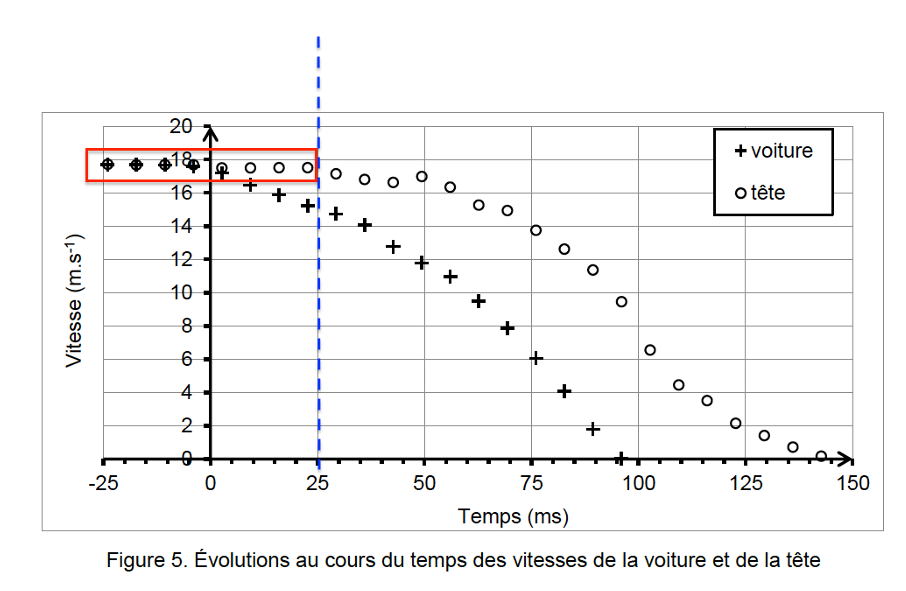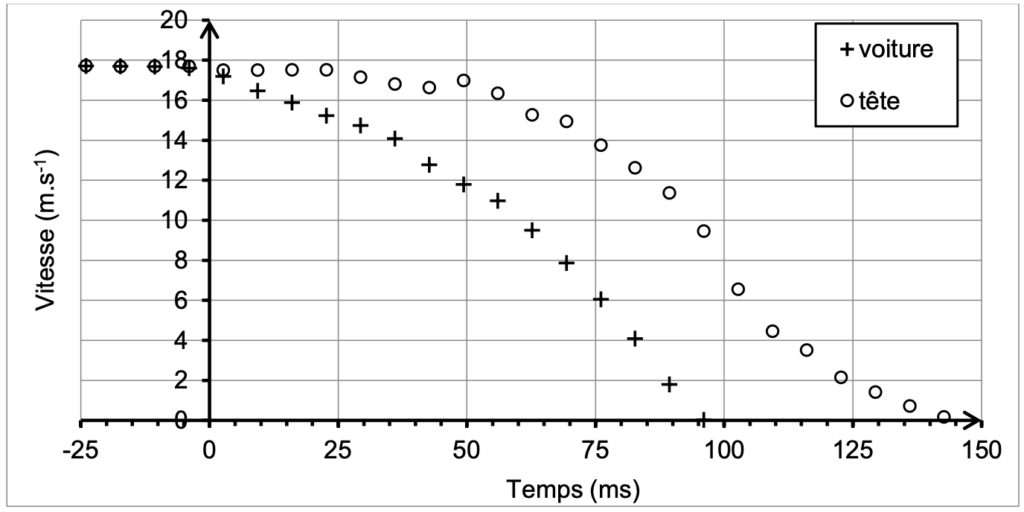 2. L’analyse de la vidéo permet de représenter les vitesses d’une des mires de la portière arrière de la voiture et de la tête du mannequin simulant le conducteur.